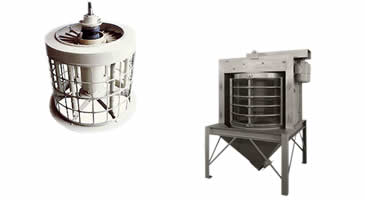 Delivered by the usual methods, the material is spread evenly onto a vaned distribution plate on top of the rotating, vibrating screening drum.